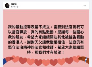 暴動罪表證不成立今被撤控 陳虹秀︰繼續堅持才有希望