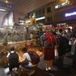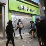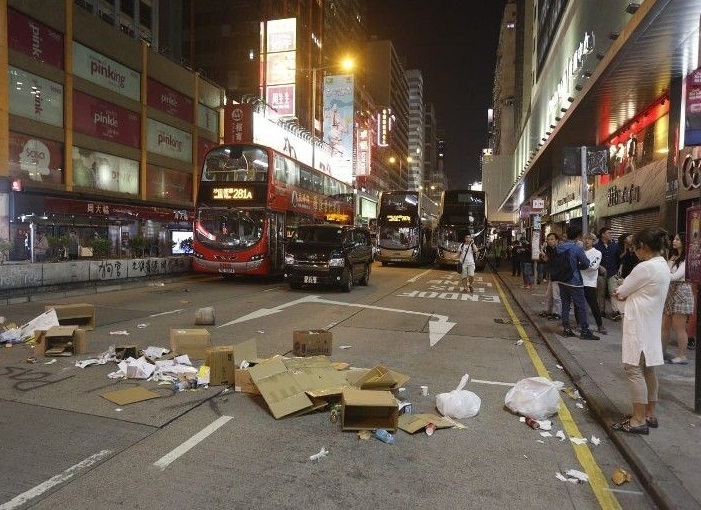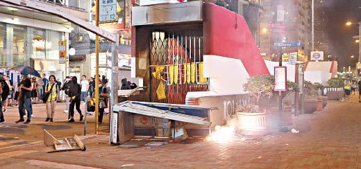 屡成示威者破坏目标的旺角站及太子站,昨傍晚开始聚集大批黑衣人,晚上约九时,他们分头行动,有人爬上旺角站出口破坏港铁标志,在外牆喷漆涂鸦,有人拆毁站内一个电话,现场一度冒出火光。晚上十时,在旺角站纵火的示威者试图破坏附近的华润堂,亦有人在亚皆老街一带设置路障及掘砖。