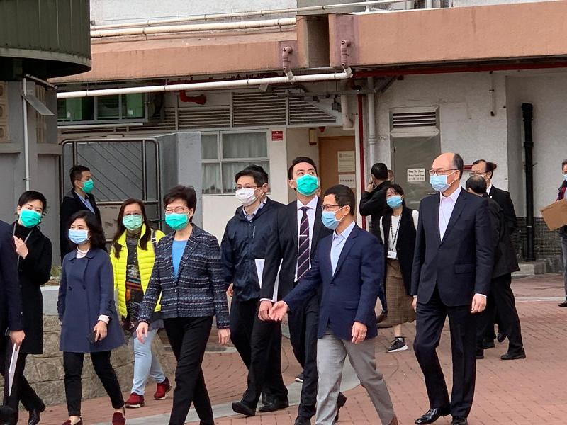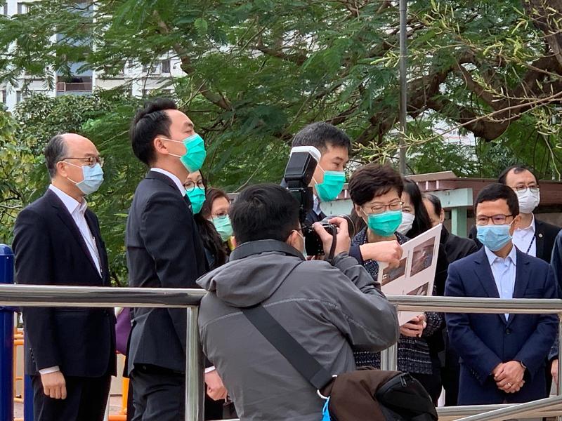 香港行政长官林郑月娥联同运输及房屋局局长陈帆,早上到青衣长康邨康美楼外视察,听取房署人员讲解渠管设计。他们全程戴上口罩,在现场逗留不足半小时后离开。