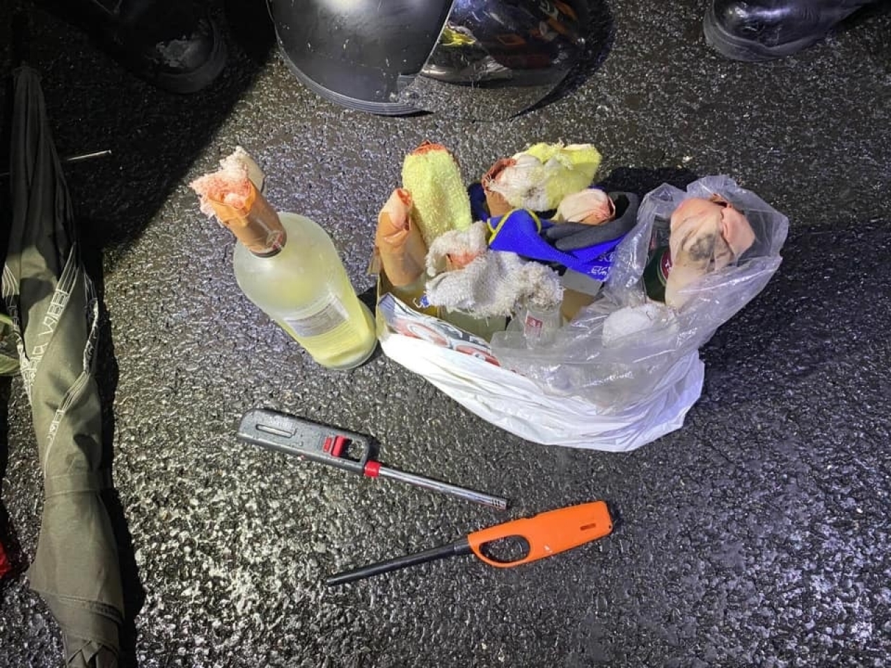 警方说,晚上近7时,在尚德邨停车场内的角落,检获汽油弹、玻璃樽、打火机及一批砖头等,不排除在示威活动使用。