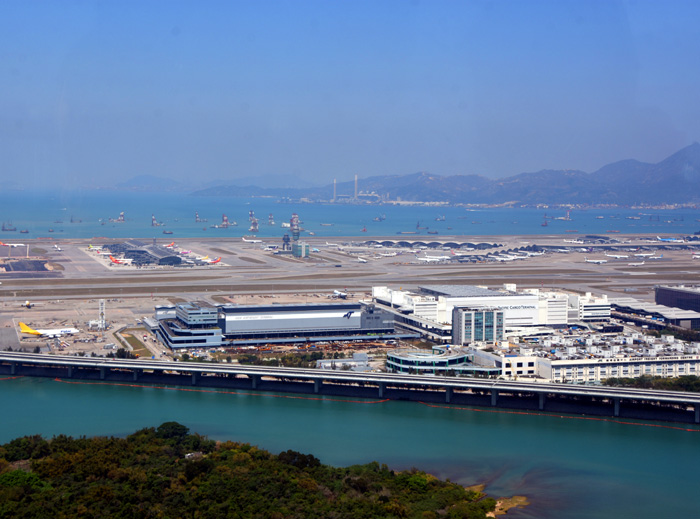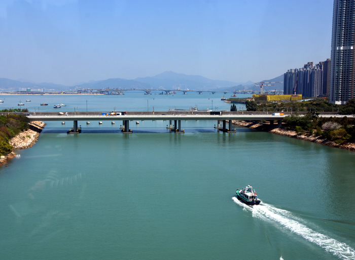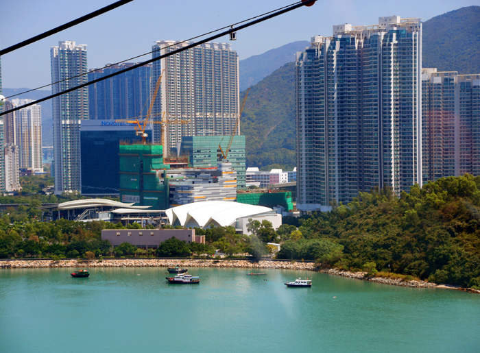 乘缆车前往大屿山途中观赏海天风光的景象十分壮美,香港国际机场与粤港澳跨海大桥等景观历历在目。特别是从缆车上俯瞰大海中壮观的粤港澳大桥,好像从陆地上架起伸进大海中的一条飞龙,而延伸的跨海大桥的龙头好似钻进了大海。