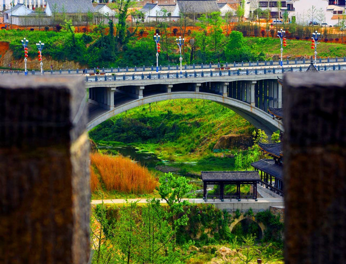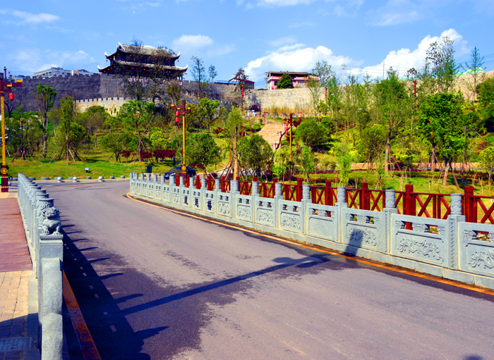 从城墙的垛口向外看,潮音阁掩映在绿树从中,溪水潺潺,碧波一潭,植被茂盛,五颜六色的花草,拥有古老历史传说的平越驿站景观,福泉古城墙文物保护纪念碑,古墙牌坊等古城小景交相辉映,古与今的交融,无不诠释体现着福泉古城其深厚的文化底蕴。