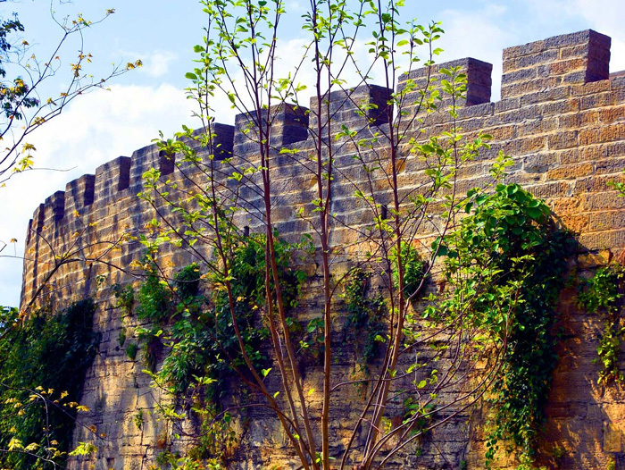 平越卫城是明洪武十四年(1381)修建的,起初是一座土城。到了洪武二十四年(1391),便改为石头城。它的周长有4 700米,墙高7米,厚3米。原先有4座石拱的城门,3座月城。什么是“月城”呢?就是在城门外边还加上一个半“月”形的城墙,用来增强防御功能。