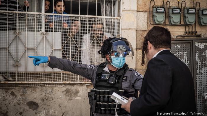 无一例外 以色列也出台了严格的防疫措施。总理内塔尼亚胡发布了强制性命令,禁止民众外出。警察和军队负责巡逻检查。正统派犹太教徒也必须遵守这一点。在耶路撒冷米阿谢里姆(Mea Shearim)地区,一名警察正在命令一名男子回家。