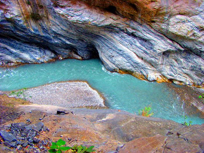 尤其令人叫绝的是,被切割的竟是长达数十公里、厚度超过1000米的大理石岩层!致使裸露在立雾溪两岸的危崖,乃至兀立在奔腾溪水之中的怪石,皆是白色的、间有层层图纹的大理岩,绝无仅有,极具特色,所以,太鲁阁大峡谷也被誉为大理石峡谷。