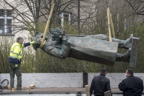 捷克首都一个广场上的前苏军将领伊万-科涅夫元帅的雕像4月3日被吊车拆卸下来,转移到一个即将开张的博物馆里。