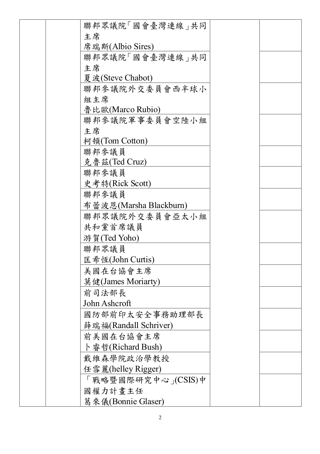 美國則有多位國會議員和重量級行政官員在祝賀影片現身,包括美國國務院亞太助卿史達偉(David Stilwell)和美國副國安顧問博明(Matthew Pottinger)、聯邦參議院外交事務委員會主席里契(James Risch)等。史達偉和博明都肯定台灣在蔡總統領導下繼續落實民主,也對台灣抗疫有方,援助美國和各國表達感謝。