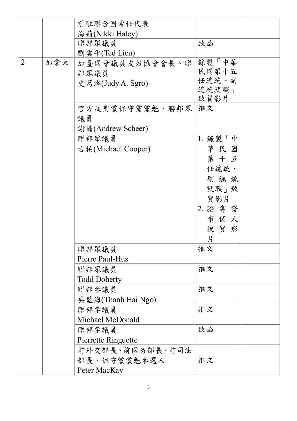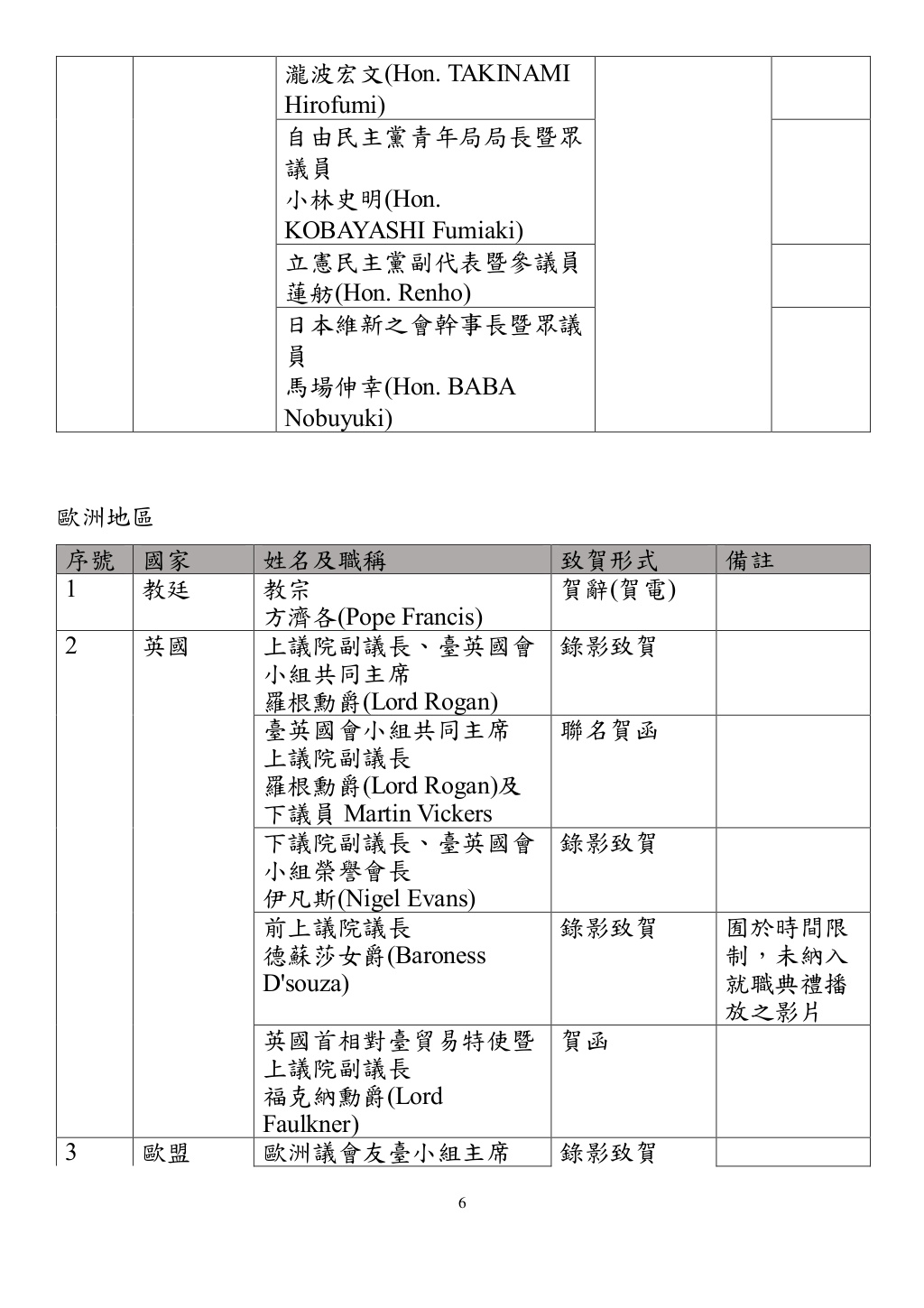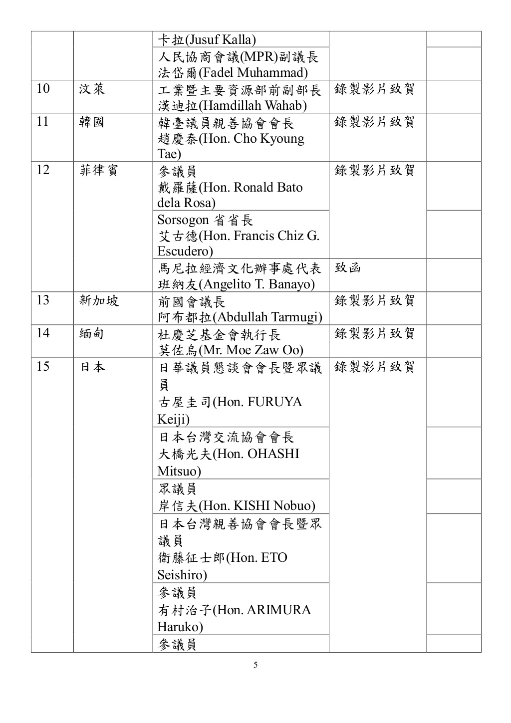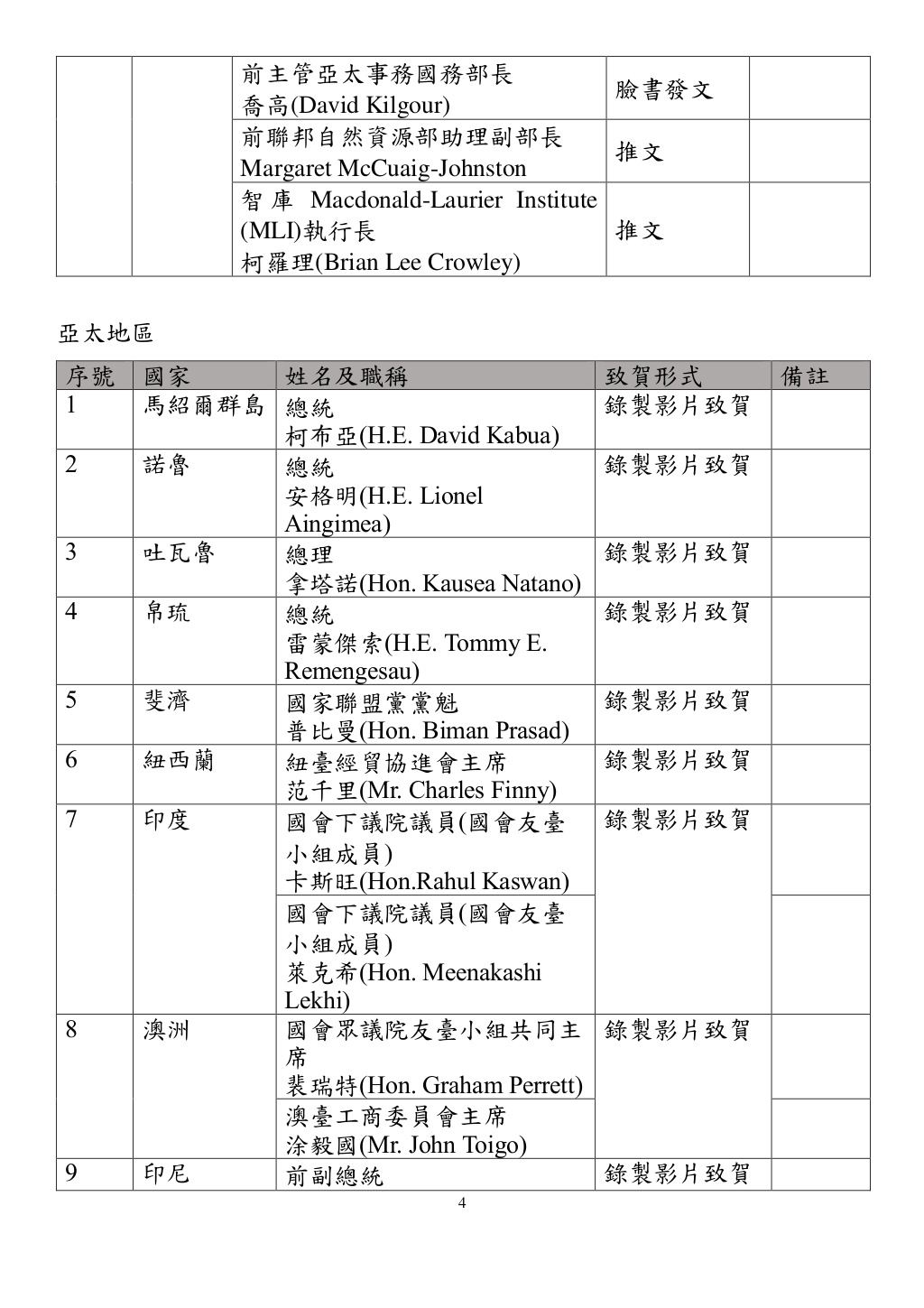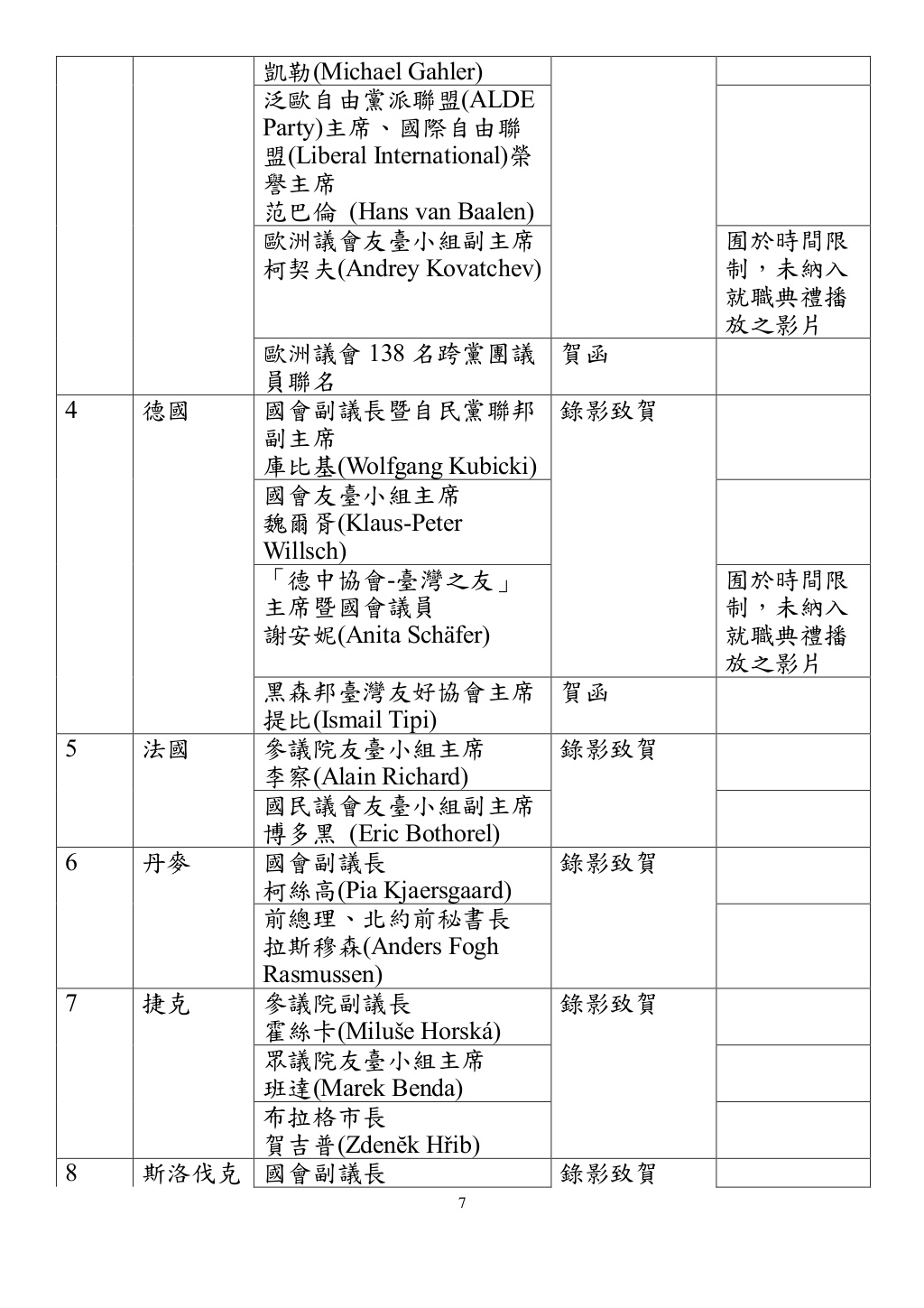 其他國家方面,包括德國、丹麥、捷克、斯洛伐克、英國等國會副議長;日本、印度、韓國、德國、法國、義大利、波蘭、捷克、立陶宛、拉脫維亞、加拿大等國友台議員;印尼、丹麥等前國家領導人錄影道賀。在台灣擁有高人氣的布拉格市長賀瑞普(Zdeněk Hřib)也入鏡。
