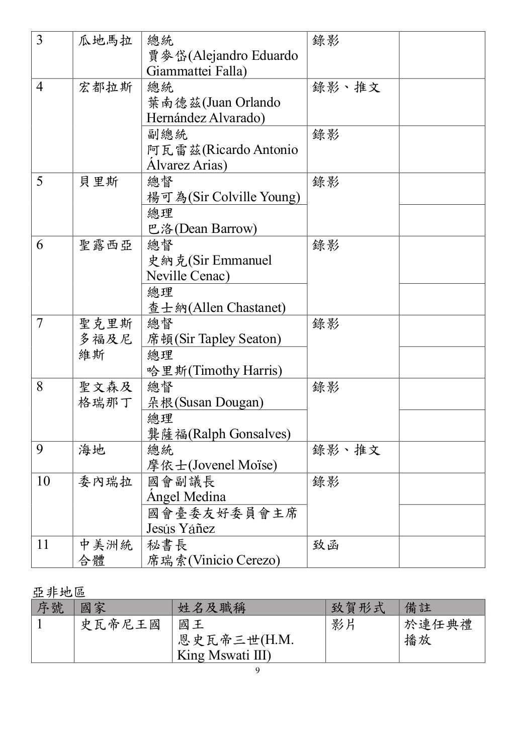 於台北賓館播出精簡版祝賀影音的包括友邦史瓦帝尼國王,瓜地馬拉、海地、宏都拉斯、馬紹爾群島、諾魯、帛琉、貝里斯、聖克里斯多福及尼維斯、聖露西亞、聖文森及格瑞那丁、吐瓦魯總統或總理,尼加拉瓜和巴拉圭則由副總統道賀。