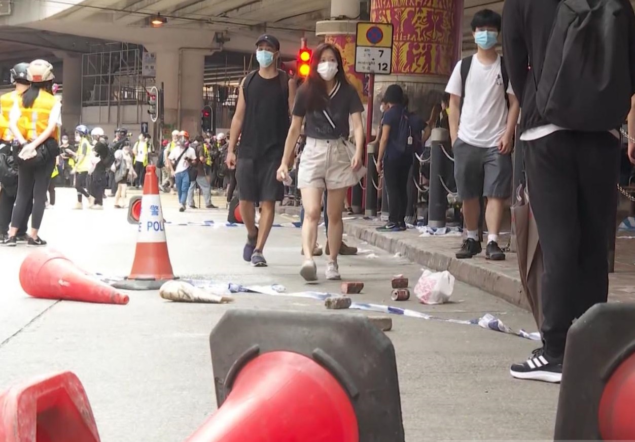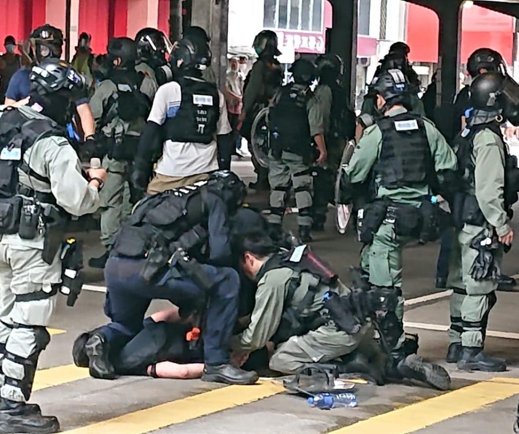 警方在現場多次向在場人士高舉藍旗,警告他們正參與非法集結,之後多名防暴警員在馬路制服一名男子,將他綁上索帶,隨後再舉起黑旗,並施放多枚催淚彈。