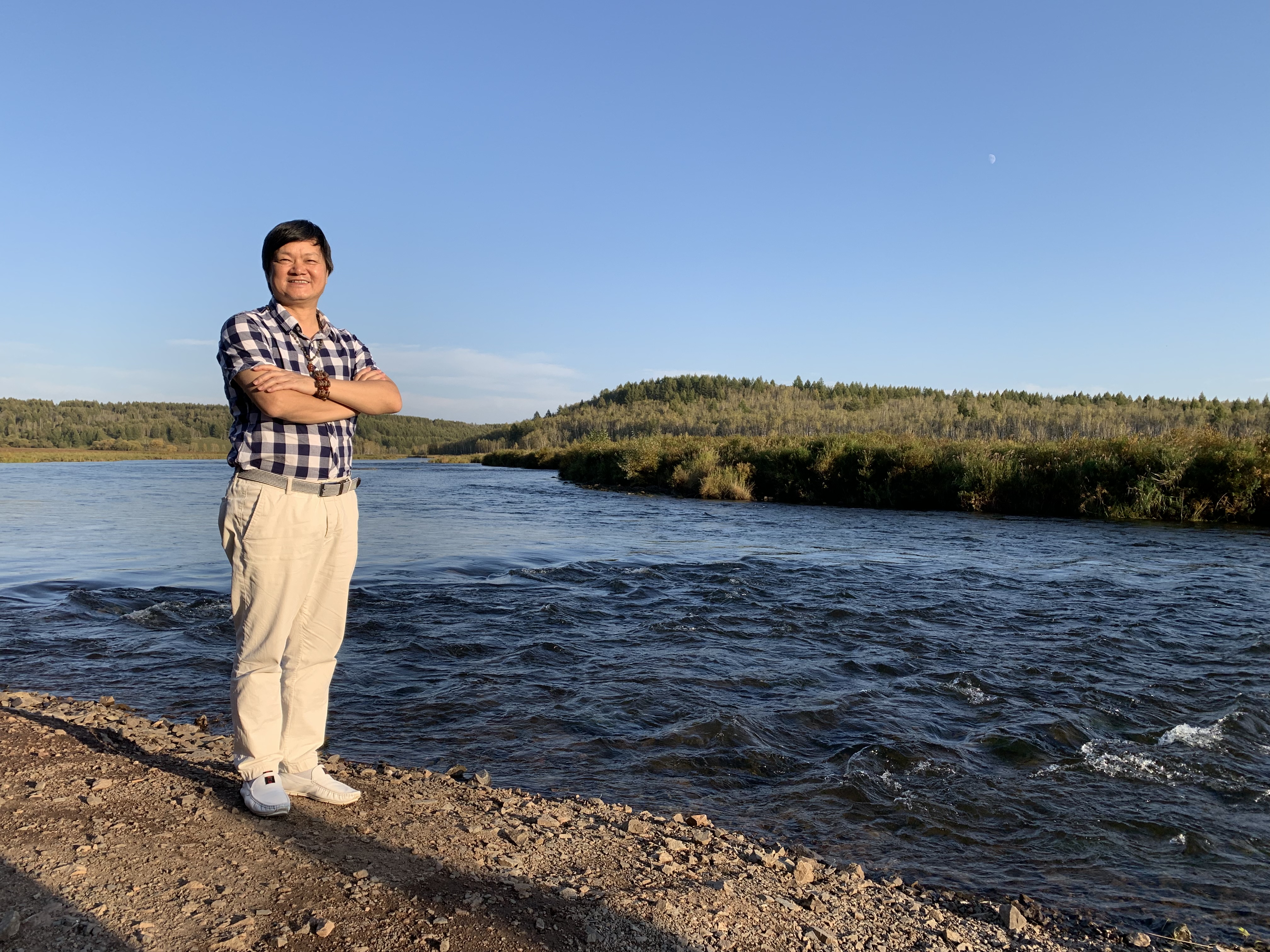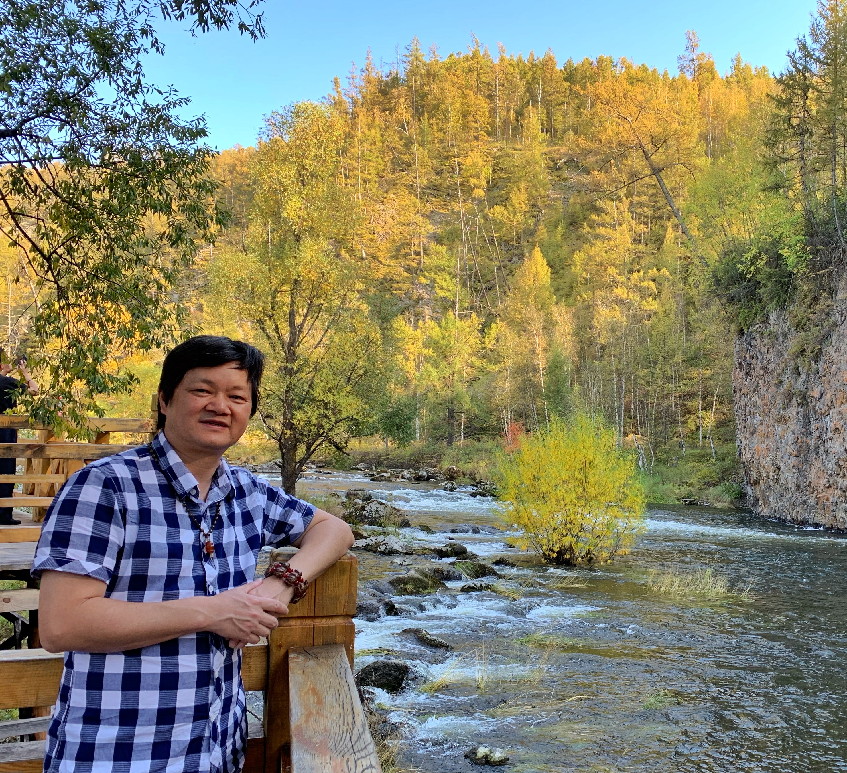 2019年9月6日一早,呼和浩特朋友中医师杨生接我,他说烧麦好吃,就转了几圈才找到了店,轻松吃上后,到了呼市机场,碰到前天还在甘肃平凉市围棋赛上一起的中国围棋协会主席林建超将军和甘肃省围棋协会的秘书长蒋立峰,他们一早从西安飞来,经停呼市,我们从呼市到阿尔山要到乌兰浩特机场转机,已经周折终于到了内蒙阿尔山,也沒有想到我在转机的乌兰浩特机场就接到一位素未谋面的兰州马文才先生的师弟陈国生先生,他是中国冰雪画派研究会会员、内蒙古冰雪画家、内蒙古工艺美术会员、兴安盟美术家协会理事、阿尔山美术家副主席,他打造家乡冷文化为主、彰显北方自然雪景风光和人文景观。我们一见如故,他开着摩托车到阿尔山机场接我,并与我交谈,约定下午开车到我们下榻的御荣国际大酒店接我去阿尔山相关风景旅游景点走走。