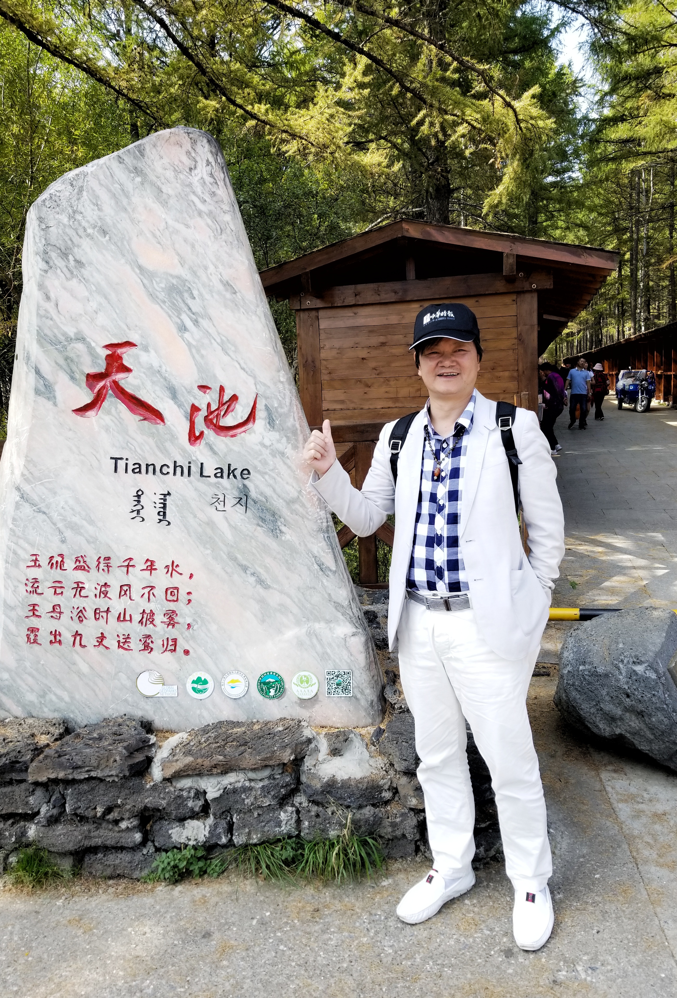 坐着大巴,第一站我们到天池,其实还要爬山去才能看到阿尔山天池的真容,通往天池的公园台阶路上标注:上山998级台阶,下山768级台阶,随行甘肃省围棋协会秘书长蒋先生,爬了到三分之一就爬不动了,他找来抬轿工把他抬上山去了……