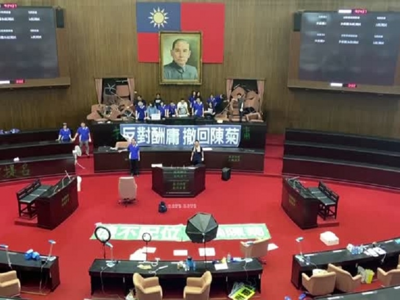(中華時報台灣訊)國民黨部分立委由昨日下午起佔據立法院會議廳,要求蔡英文總統撤銷對總統府前秘書長陳菊的監察院長提名。民進黨立委上午進入會議廳,與國民黨人士發生推撞,最終奪回主席台主導權,結束藍營長達20多小時佔領立法院行動。