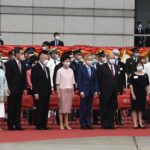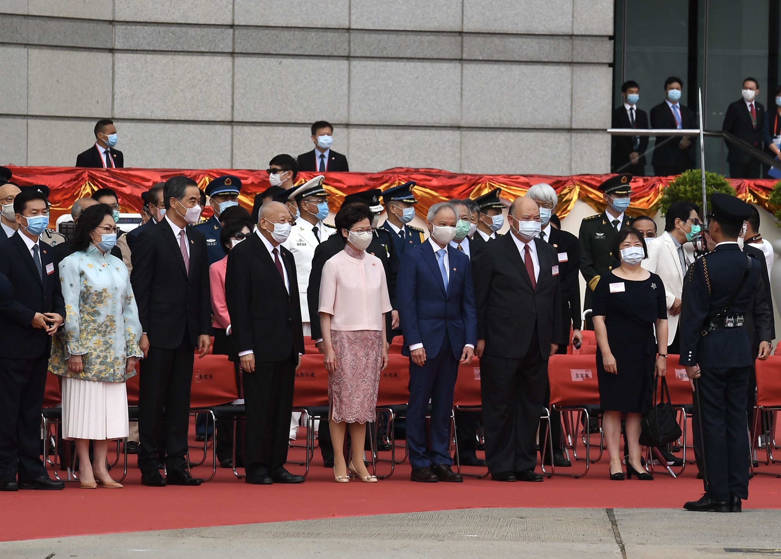 (中华时报香港讯)香港特區成立23周年,灣仔金紫荊廣場早上8時舉行升旗儀式,出席升旗儀式的嘉賓包括行政長官林鄭月娥、前特首董建華、梁振英、曾蔭權,各司局長、行會成員、立法會主席和部分建制派議員、終審法院首席法官馬道立,以及中聯辦主任部駱惠寧、外交部駐港特派員公署特派員謝鋒,以及解放軍駐港部隊司令員陳道祥等。