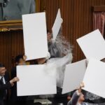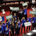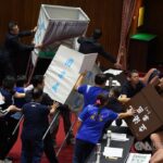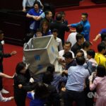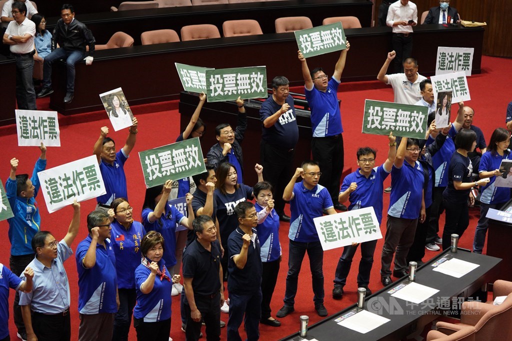 立法院會17日進行監察院人事同意權案投票,國民黨立委丟水球、灑水企圖阻擋開票,並與民進黨立委爆發肢體衝突。中央社記者徐肇昌攝 109年7月17日