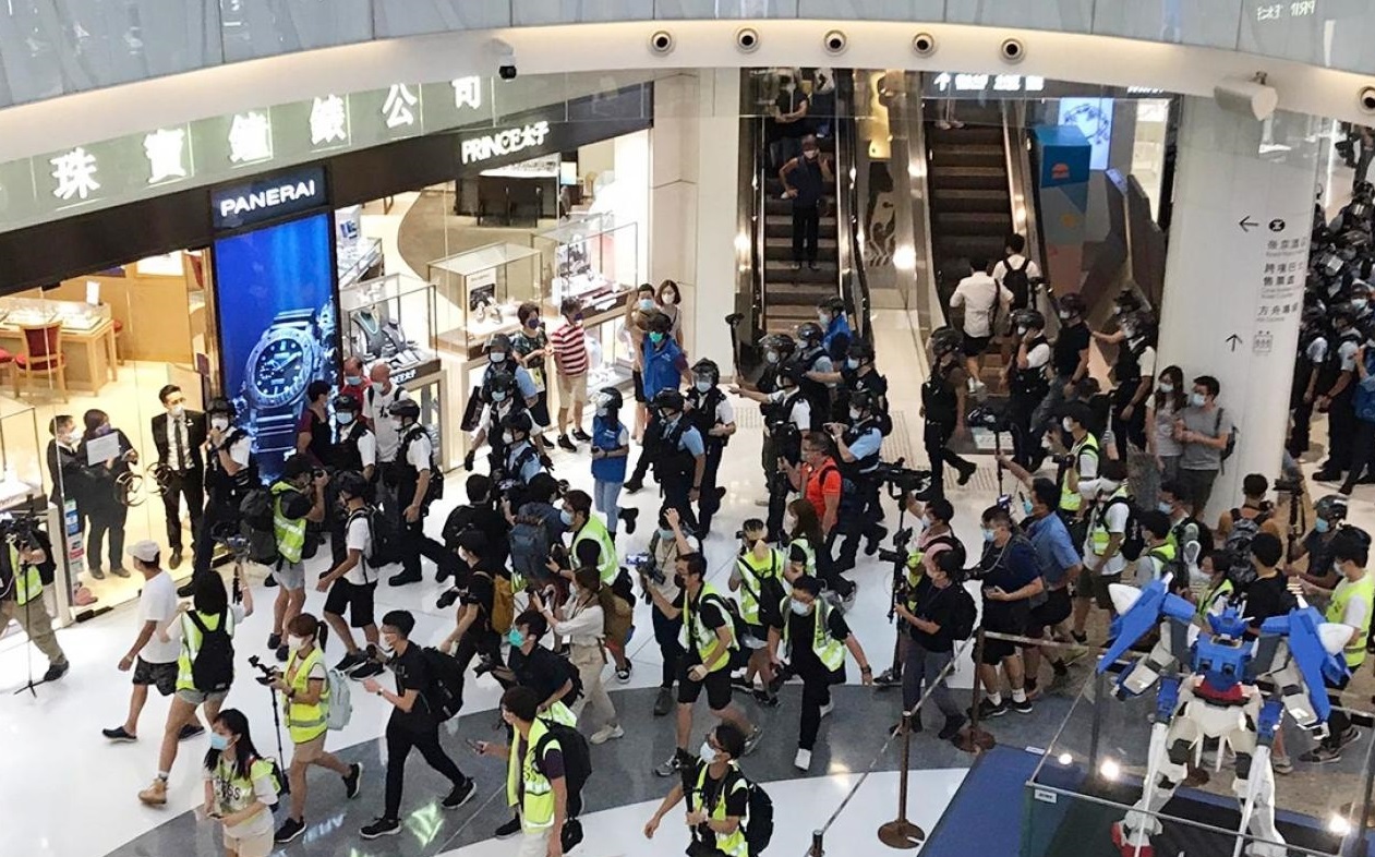 警員戴上頭盔,部分人手持盾牌及胡椒球槍,在商場巡邏,警告市民不要違反限聚令。警方其後拉起橙色封鎖線,截查多名市民,並票控他們違反限聚令。商場內有商店落閘。