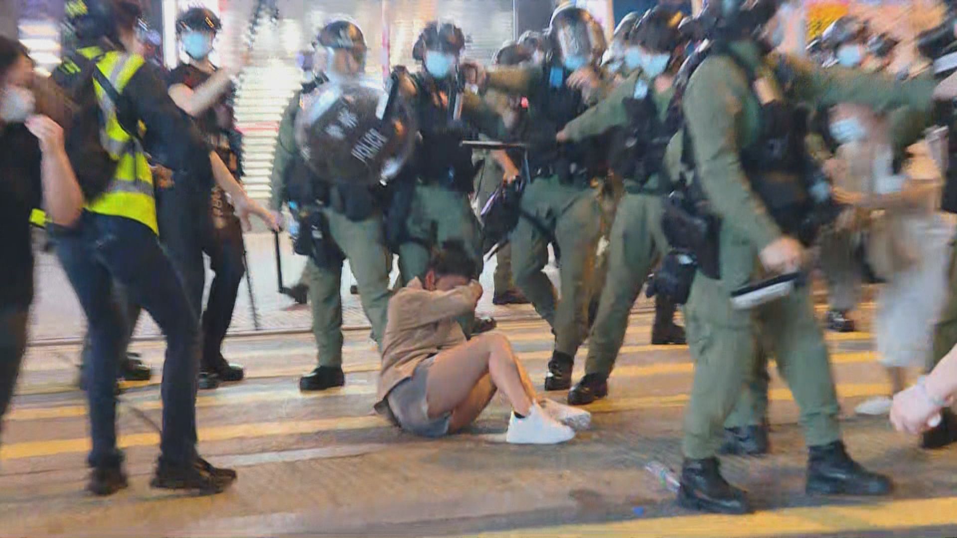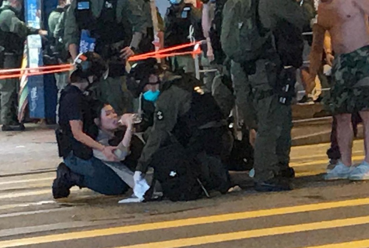 晚上近十時,警員在亞皆老街驅散,混亂中有孕婦跌倒,之後警員多次施放胡椒噴霧,她感到不適,摸著肚子,神情痛苦,坐在馬路上,她同行親友非常激動,不斷與警員理論。有女警協助跌倒孕婦,救傷車到場將她送院治理。