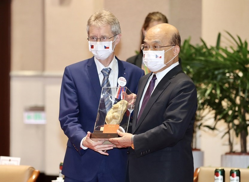 維特齊(Miloš Vystrčil)8月30日率團訪問台灣,蘇貞昌下午在行政院接見維特齊訪團,因應疫情,蘇貞昌和維特齊以擊肘取代握手,也都配戴口罩,蘇貞昌還特別準備捷克品牌的皮爾森歐克啤酒招待訪團。