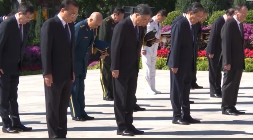 兩岸大陆 習近平率黨和國家領導人出席紀念抗戰勝利75周年儀式 由 中華時報總編室 - 2020年9月3日 今日是中國人民抗日戰爭勝利紀念日。中共總書記、國家主席習近平率領6名政治局常委,以及久未露面的國家副主席王岐山等黨和國家領導人,向抗戰烈士敬獻花籃,紀念二戰及抗日戰爭勝利75周年。 儀式早上10時在中國人民抗日戰爭紀念館舉行,以國家名義向抗戰烈士致敬,習近平等人身穿黑色西裝進場,向抗戰生還者致敬。 獻花儀式由北京市委書記蔡奇主持,現場先奏唱國歌,眾人再向犧牲的烈士默哀,並舉行獻花籃儀式,抗戰烈士的親人和家屬、解放軍海陸空三軍代表、北京各界代表亦有出席。