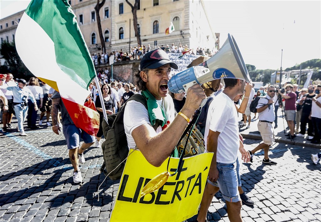 約千人5日在羅馬市中心走上街頭,抗議強制學童戴口罩及強制接種疫苗。