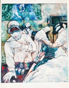 《疫情》(1-2) (紙本重彩 25x20cm;《疫情》(3-8) (紙本重彩 12x10cm;《疫情》(9-10) (紙本重彩 13x18cm