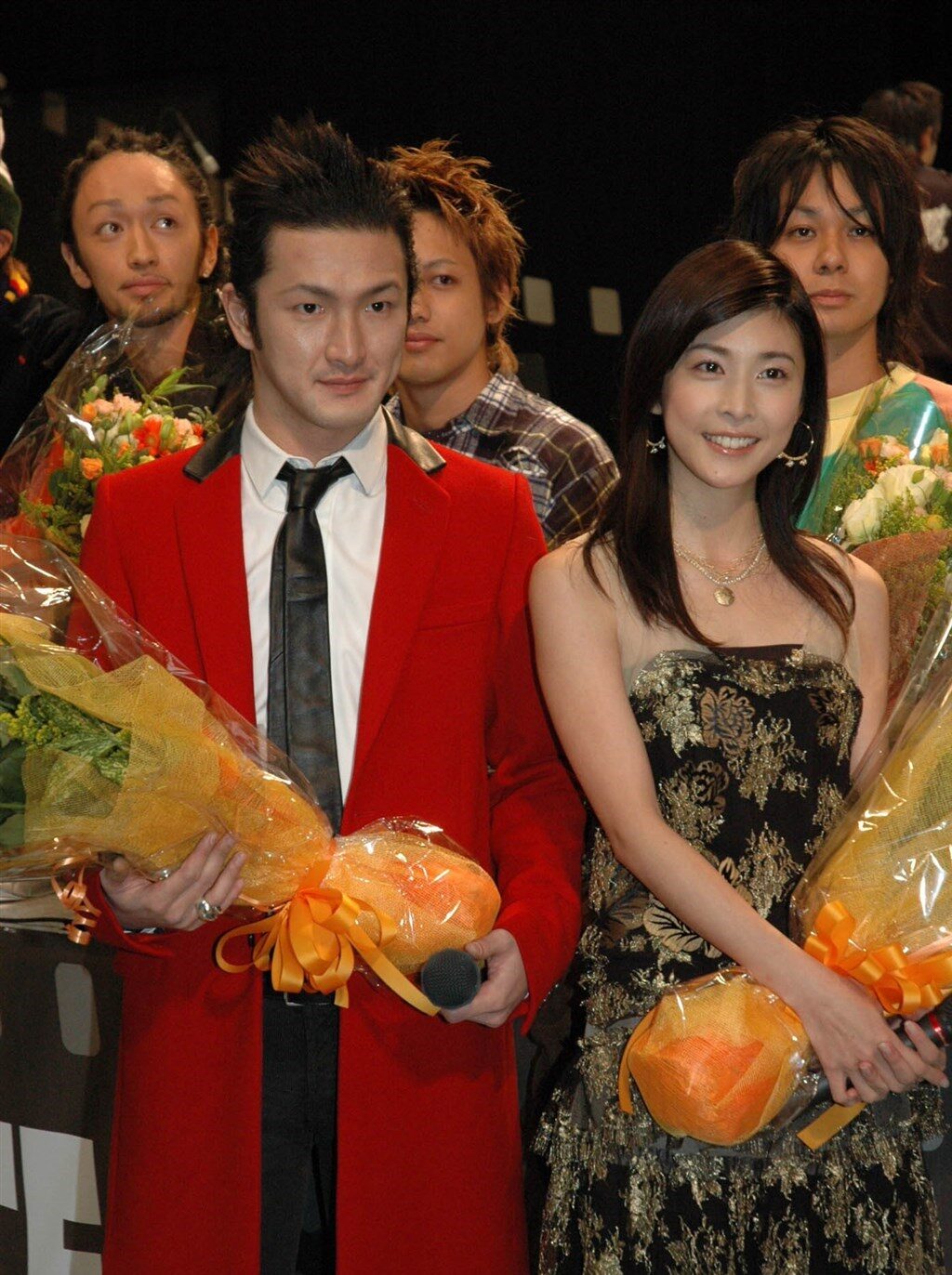 2004年10月27日,本屆東京國際影展特別觀摩片「現在,很想見你」的男女主角中村獅童(前左)和竹內結子(前右)與影迷們會面;兩人因戲結緣,婚後育有一子,2008年離婚。