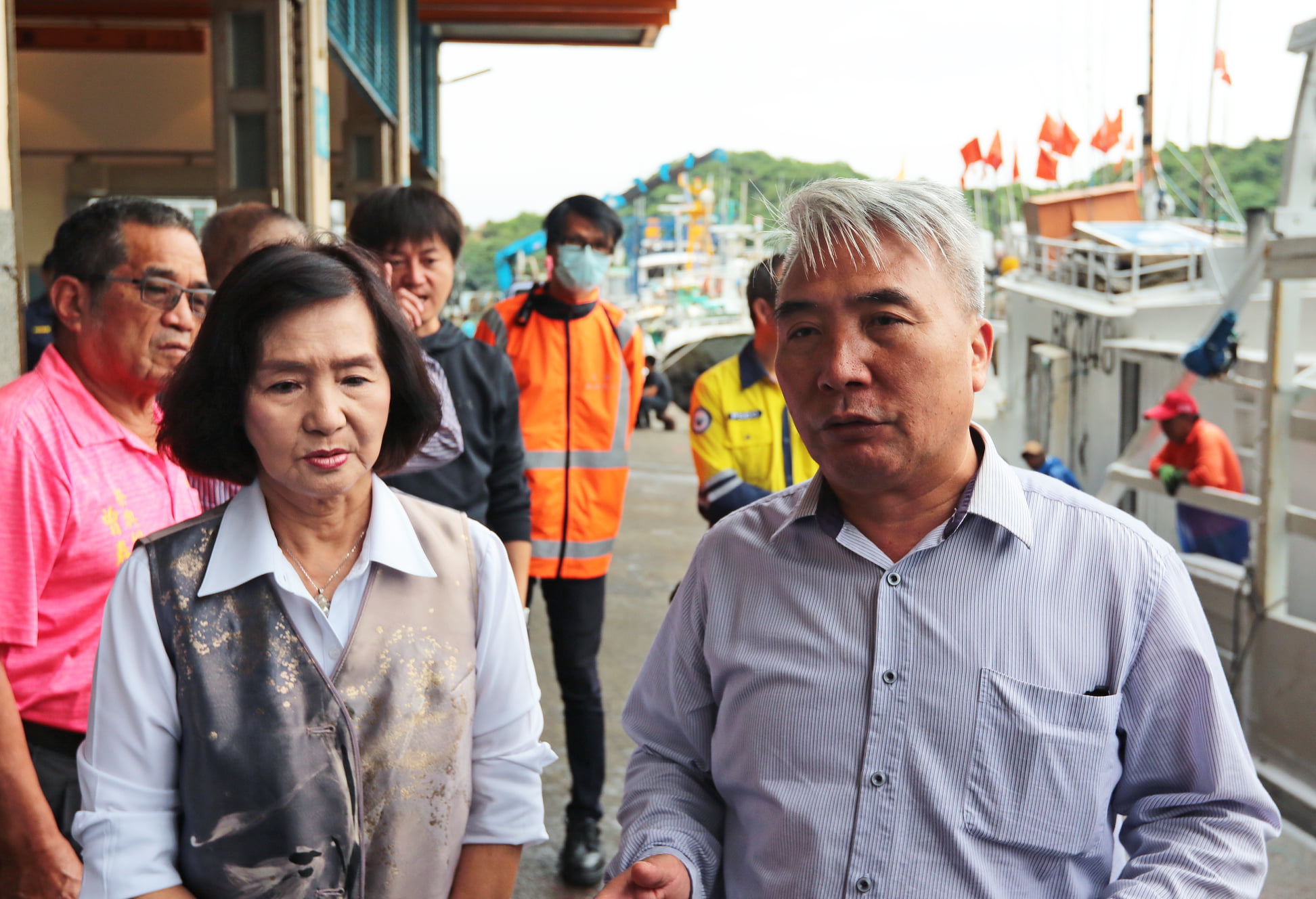 今(28)日清晨,「新」船返抵南方澳第三漁港北岸的第三魚貨拍賣市場的碼頭停泊,今天早上,宜蘭縣長林姿妙、農業處長康立和,以及本會蔡理事長源龍、林常務監事月英及陳總幹事春生,皆到場關切「新」船員與漁船狀況。