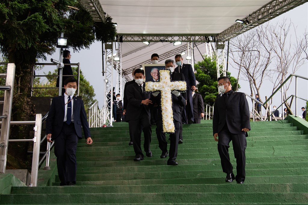 送行人員安放十字架、遺像、國旗盒、褒揚令及骨罐;李登輝家屬在靈前獻花行三鞠躬禮,再由蔡總統禮敬獻花行三鞠躬禮,隨後由主禮官副總統賴清德率陪禮人員行三鞠躬禮。