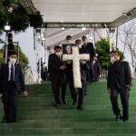 李登輝移靈車隊今天上午自翠山莊出發,李登輝的孫女李坤儀身著黑衣手捧骨灰罈、李坤儀夫婿趙贊凱手捧李登輝遺照,李登輝女兒李安妮等家屬也隨行送別李登輝最後一程。