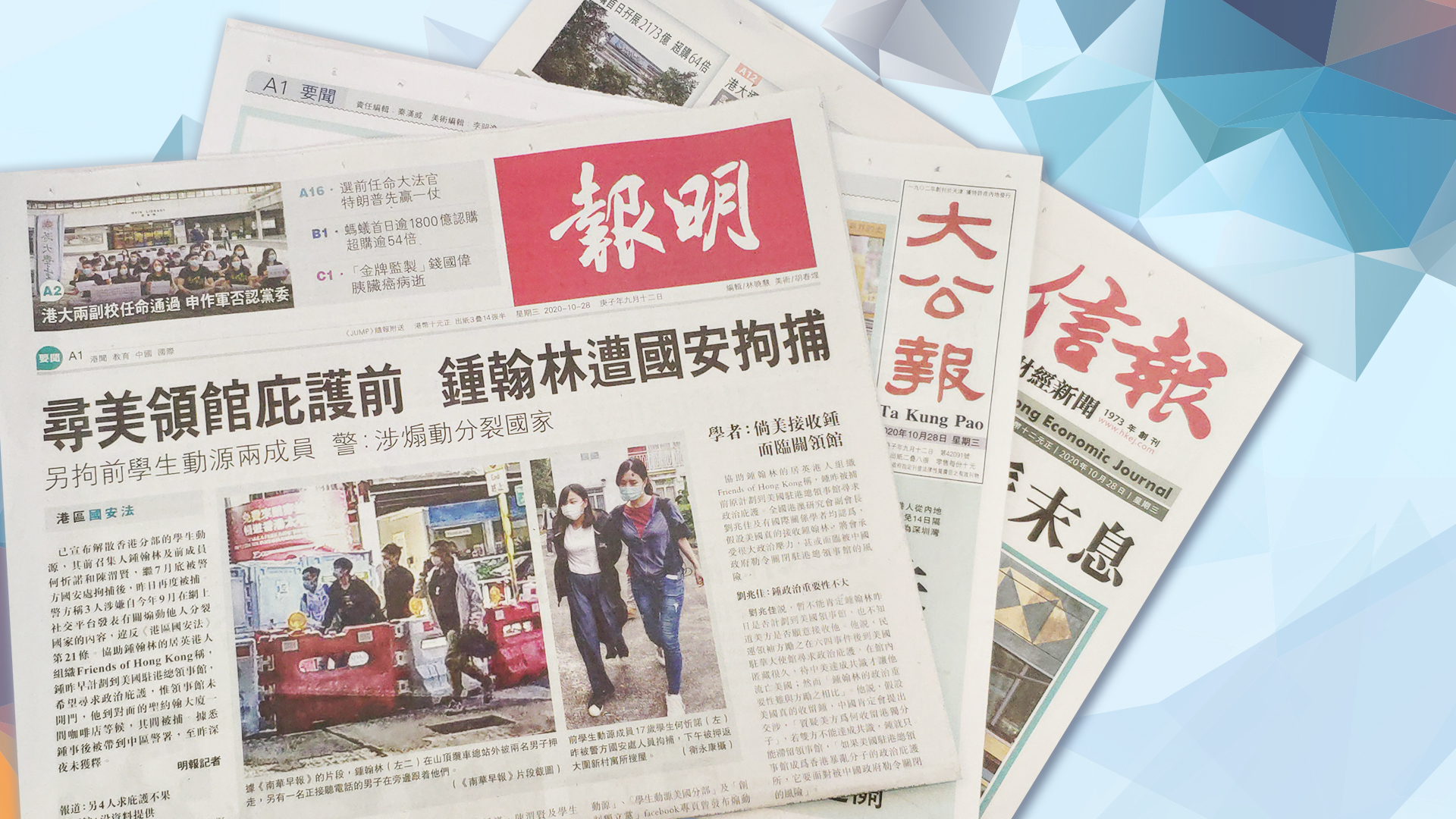 《明報》﹣ 尋美領館庇護前 鍾翰林遭國安拘捕 另拘前學生動源兩成員 警:涉煽動分裂國家