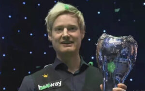 中华时报英国讯(赵雪湄)伦敦时间12月6日晚,世界排名第三的澳大利亚选手尼尔·罗伯逊(Neil Robertson)与世界第一 的英国选手贾德·特鲁姆普(Judd Trump) ,上演了一场斯诺克历史上最棋逢对手,最富戏剧性的决赛,比赛分下午和晚间二个半场;第二场从伦敦时间6日晚7点至 7日凌晨00:55分结束,耗时近6小时。最终罗伯逊以一颗粉球之微差,大比分10-9击败了特鲁姆普,职业生涯第三次捧起英锦赛冠军奖杯。