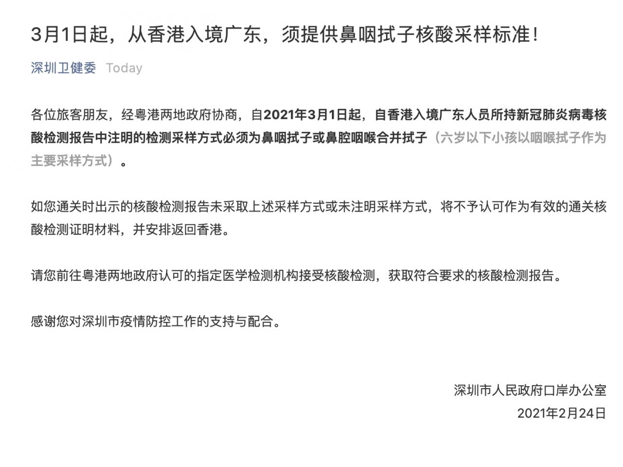 深圳市人民政府口岸辦公室表示,經粵港兩地政府協商,3月1日起,由香港入境廣東的人士,所持的病毒核酸檢測報告註明的檢測採樣方式,必須是鼻咽拭子或鼻腔咽喉合併拭子。