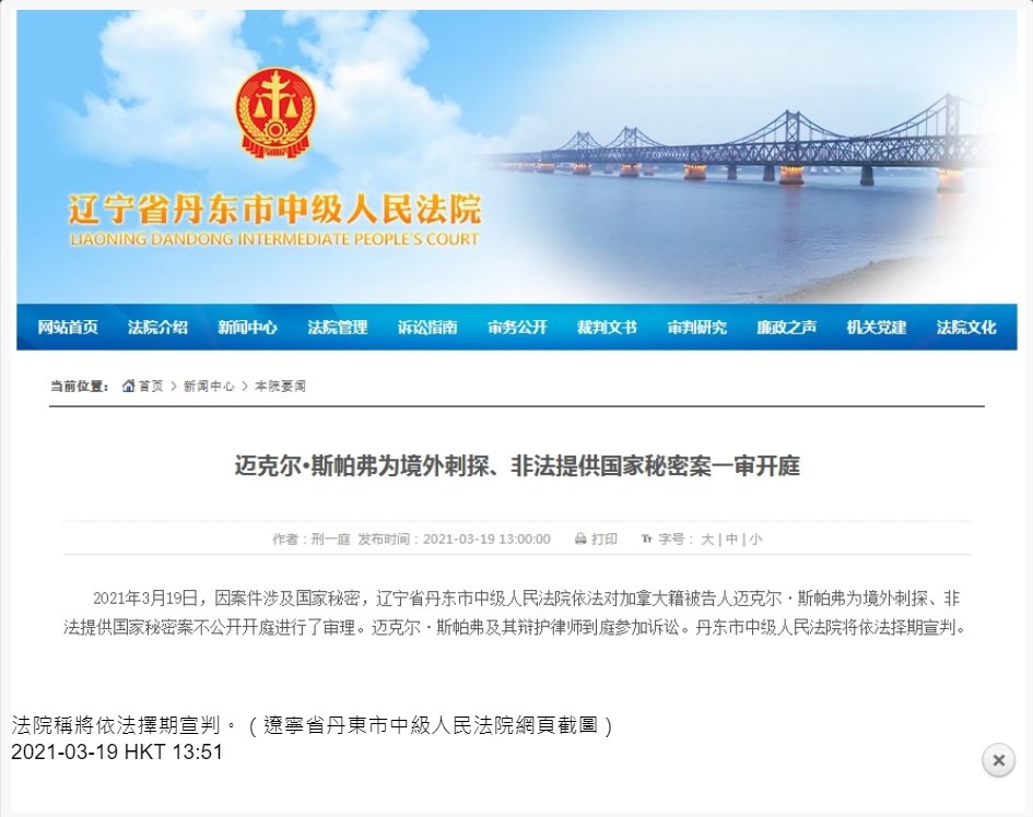 加拿大商人邁克爾涉嫌危害中國國家安全犯罪的案件,早上在遼寧省丹東市中級人民法院開審。法院表示,因案件涉及國家秘密,法院依法對被告邁克爾為境外刺探、非法提供國家秘密案,不公開開庭進行了審理,邁克爾及其辯護律師到庭參加訴訟,法院將依法擇期宣判。
