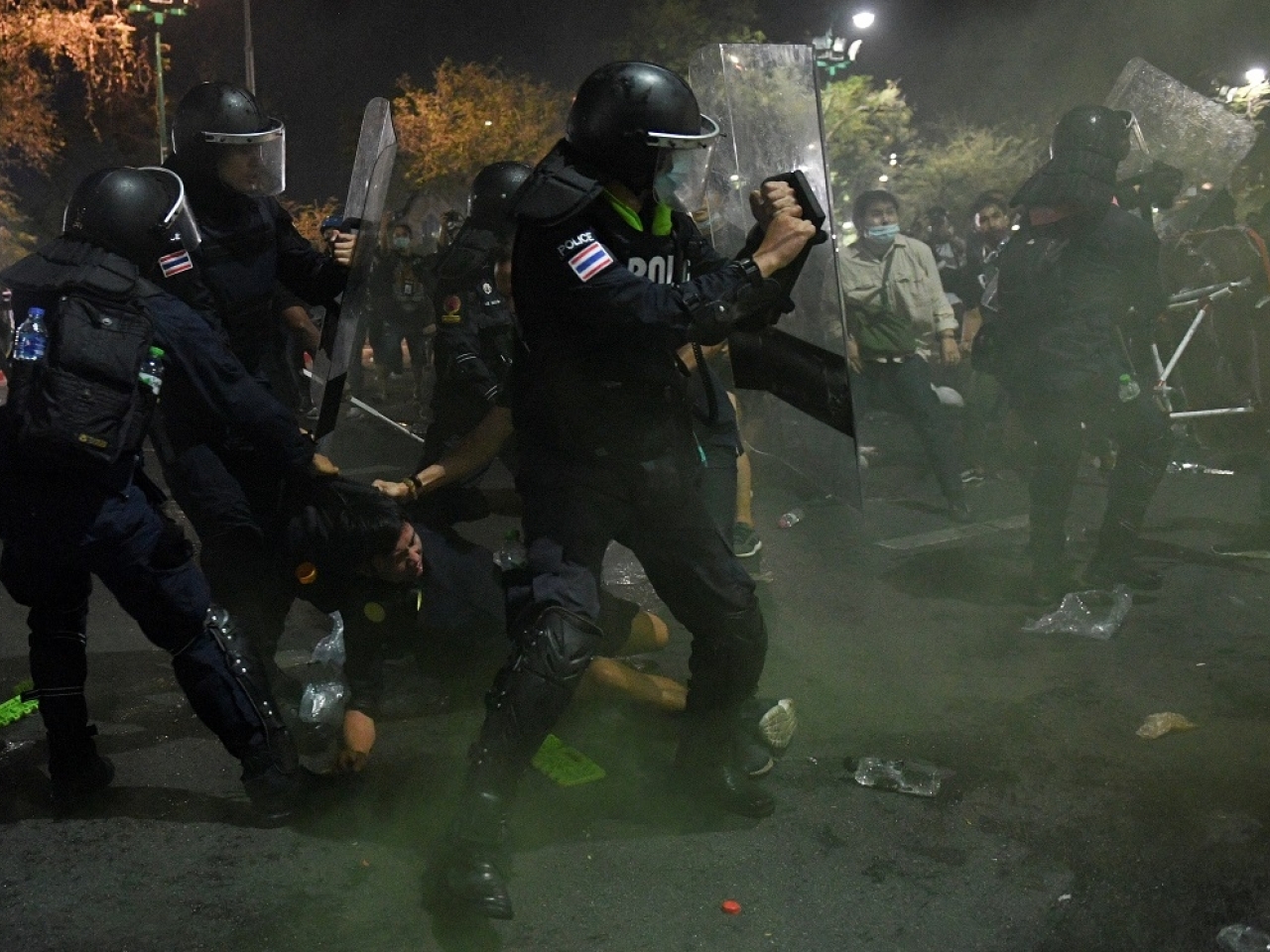 警方嚴陣以待,以巨型貨櫃和鐵絲網組成路障,並發射水砲阻止示威者向大皇宮前進,防暴警察制服多人。