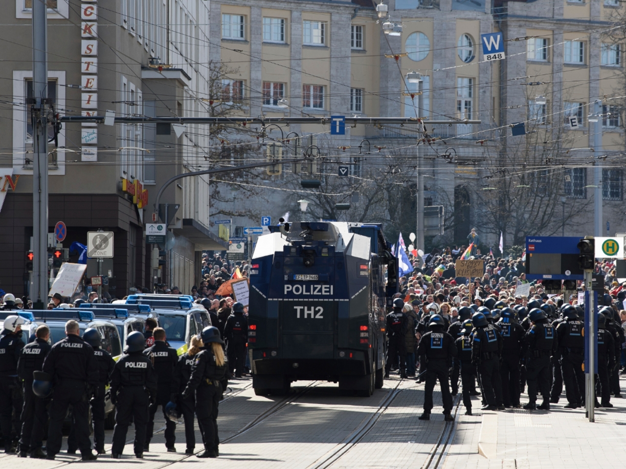 在中部城市卡塞爾,超過2萬人示威,部分示威者與反對示威活動的人衝突。數千人不理會法庭頒布的禁令在市中心遊行,大部分人無遵守當局的防疫規定,包括口罩令等;報道說有示威者襲擊警員及記者。