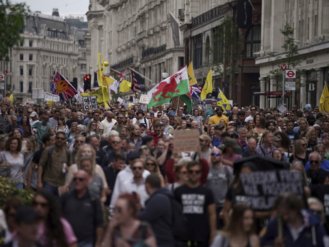 几千人星期六在伦敦市中心游行,抗议政府推迟四星期解除防疫措施,认为封锁措施影响民众的自由和权利。