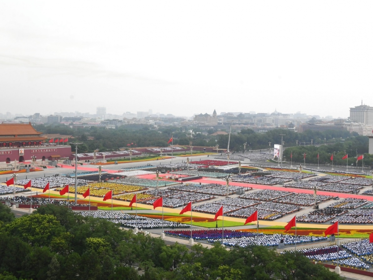 中共總書記習近平、總理李克強與其他中央政治局常委、前國家領導人胡錦濤、溫家寶等人步上天安門城樓,「直-10」直升機隊飛越天安門上空,掛上中共黨旗及慶祝標語,排列出「100」隊形,「殲-10」機隊則排列出「71」隊形,15架隱形戰鬥機「殲-20」公開亮相,機隊排列成「人」字隊形。