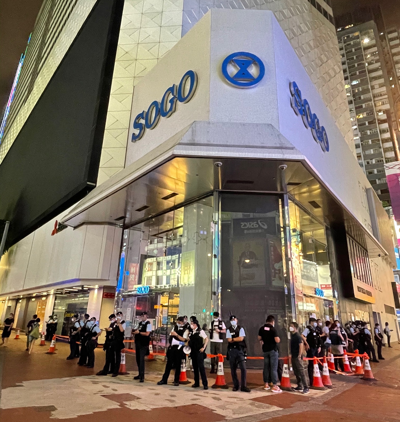 網上有人發起到銅鑼灣拜祭襲警案後自殘死亡的梁健輝,警方加強戒備。警方在現場廣播,警告市民切勿違反限聚令。崇光百貨外圍起膠帶,警員要求市民不要停留。
