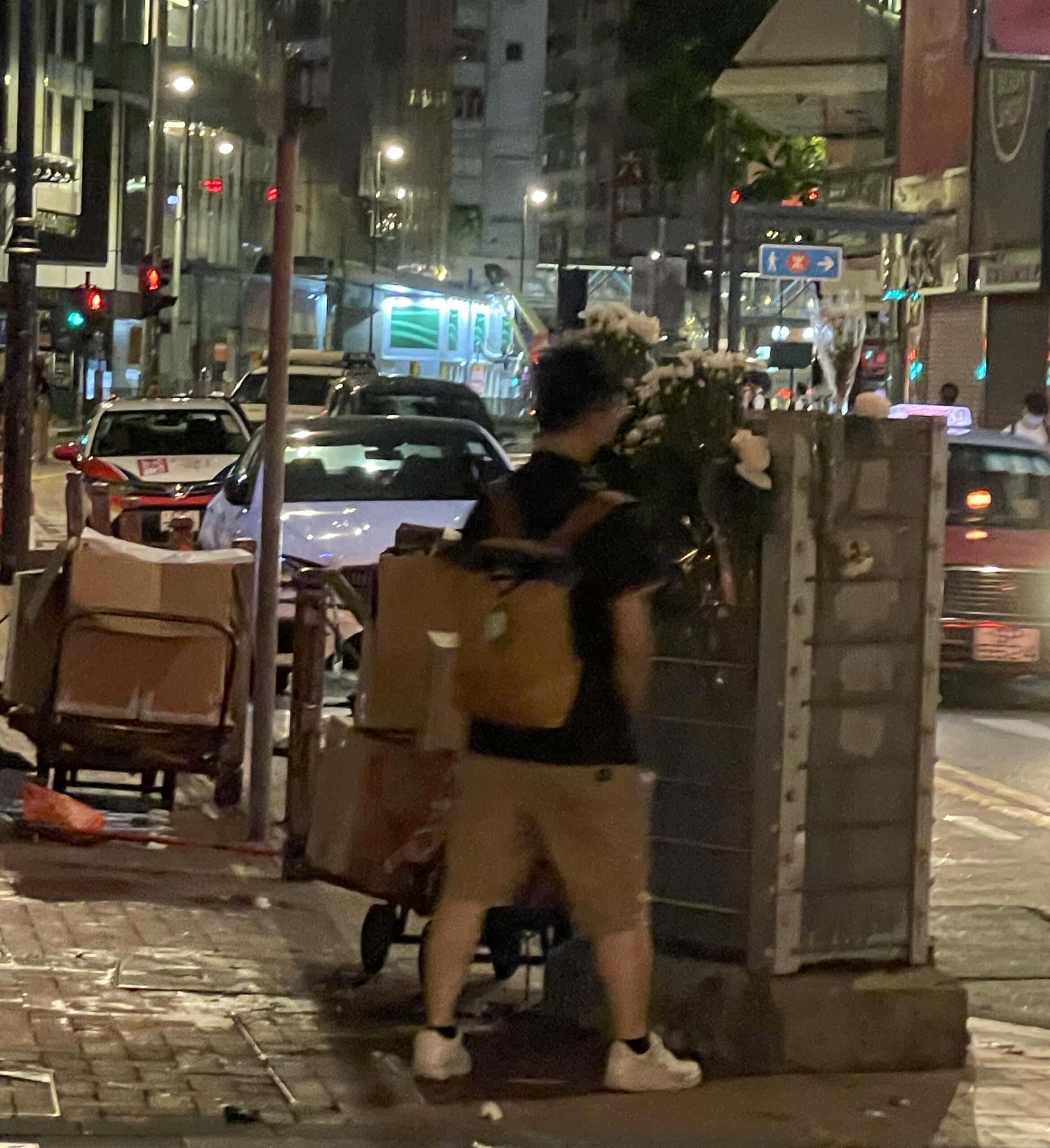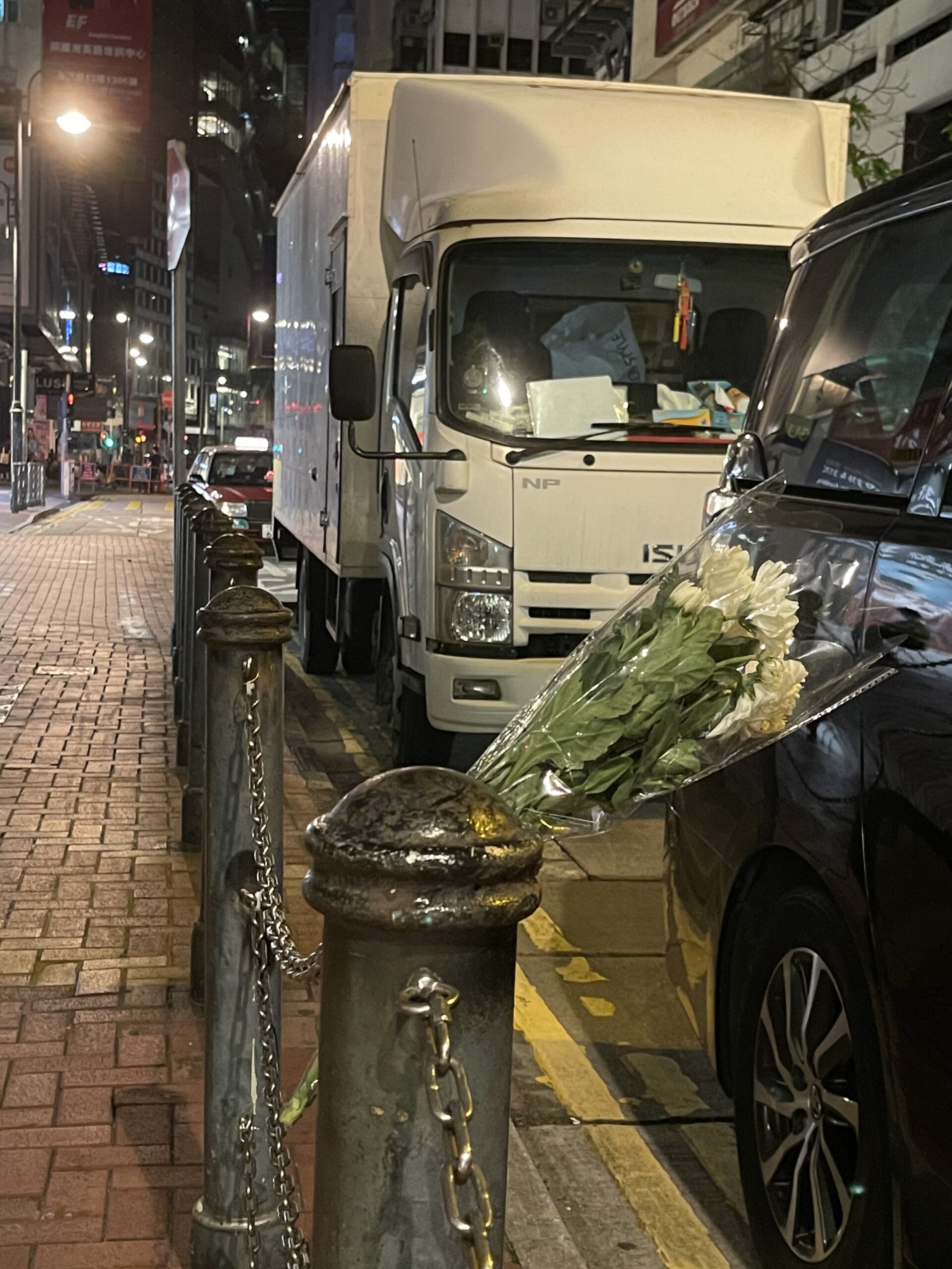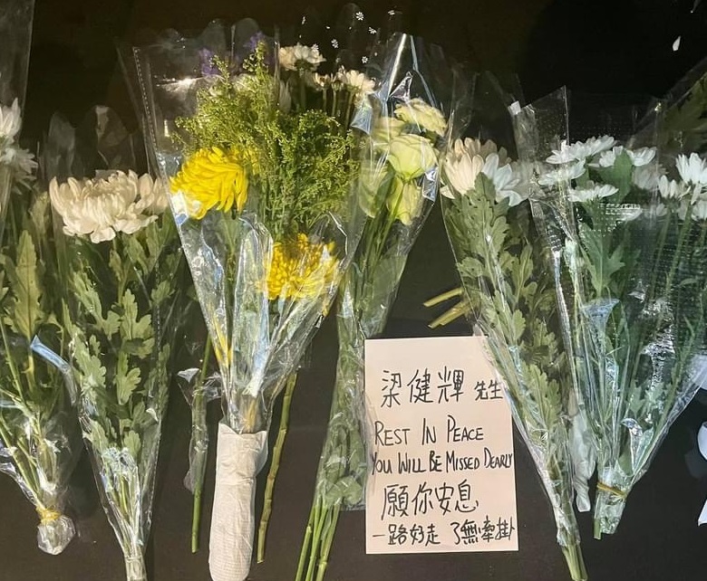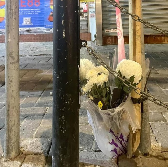 周五(2 日)晚上周六( 3日)凌晨,在接近崇光百貨的核心範圍,鮮花都會被清走,有市民則在「核心外圍」,包括怡和街圓形天橋、東角道、謝斐道的路旁,放下鮮花悼念。警員截查部分身穿黑衣的市民,又查看他們的隨身物品,有大批警員戒備。
