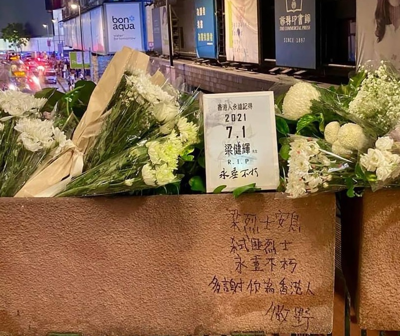 在銅鑼灣,3日凌晨一位香港年輕人(他自稱香港人)在襲警後自殘死亡的梁健輝倒地處下跪,給警察叫入警戒區域問話及搜查,隨后放行,他後來接受媒體訪問時表示,有良心的香港人要讓全世界華人記住昨天發生的事。