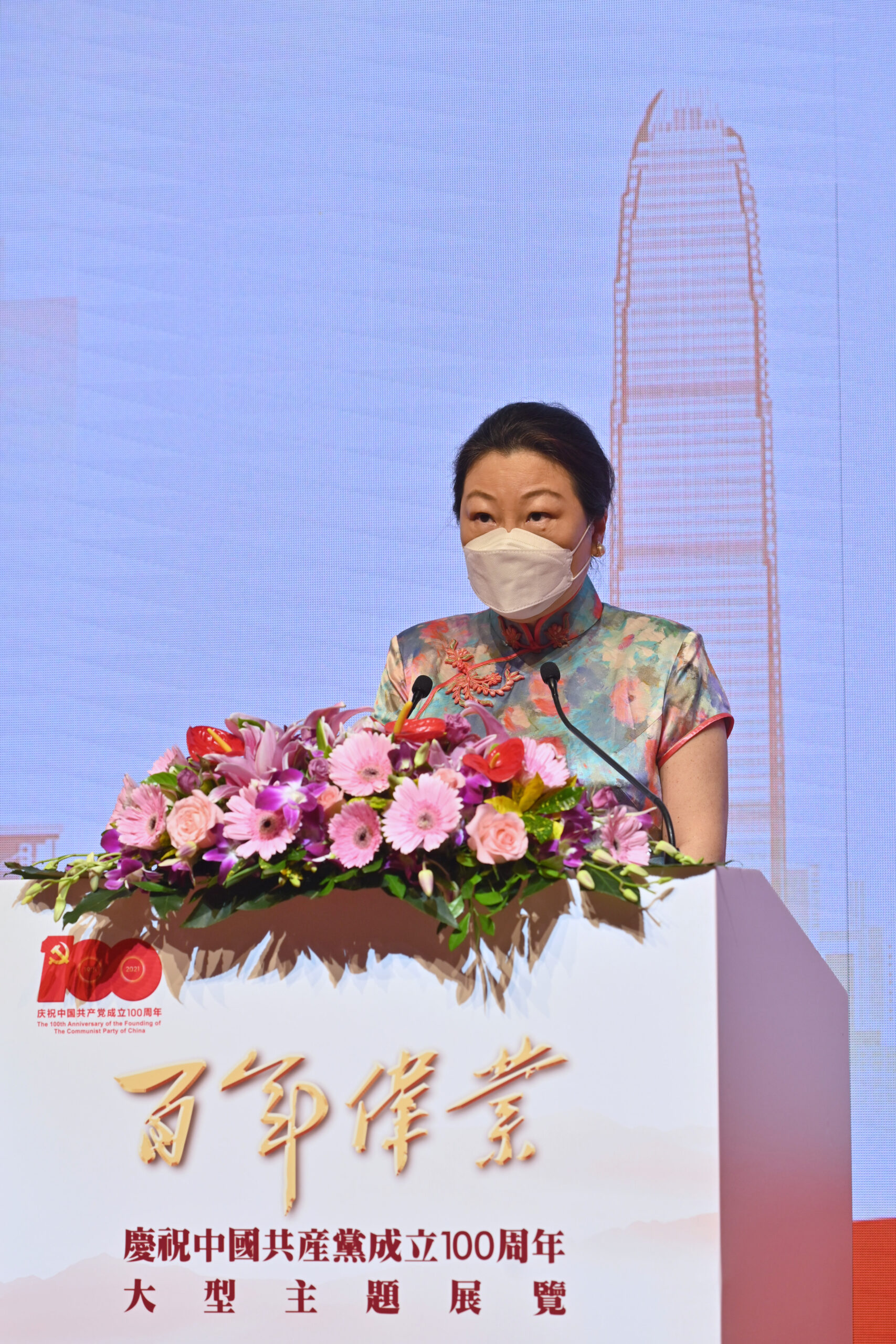 鄭若驊在一個有關中共成立100周年的展覽開幕儀式致辭,她說必須將國家所需與香港所長結合,積極融入國家發展大局,為國家發展作貢獻。
