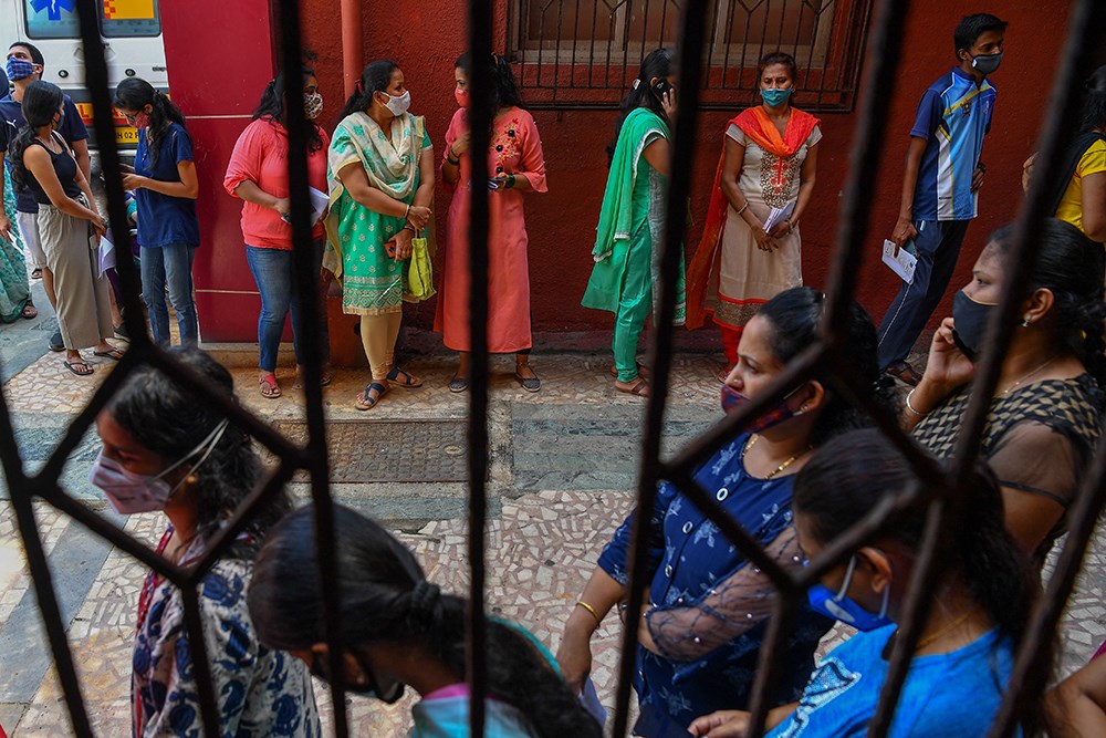 印度孟買傳出有不肖人士大賺黑心錢,讓數以千計民眾打到生理食鹽水灌充的假疫苗。圖為4日孟買民眾排隊接種Covishield疫苗。(法新社)