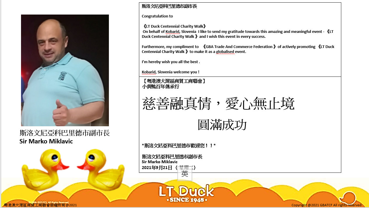 据悉,粵港澳大灣區商貿工商聯會 《 小黃鴨百年傳承行》 己獲得印尼婆羅洲皇帝、 印尼婆羅洲總理、 斯洛文尼亞科巴里德市副市長的大力支持并發來了視頻賀電 ,《 小黃鴨百年傳承行》將於2021-9-22中秋節啟動。 希望能成為每年全球華人各地的城中大事。