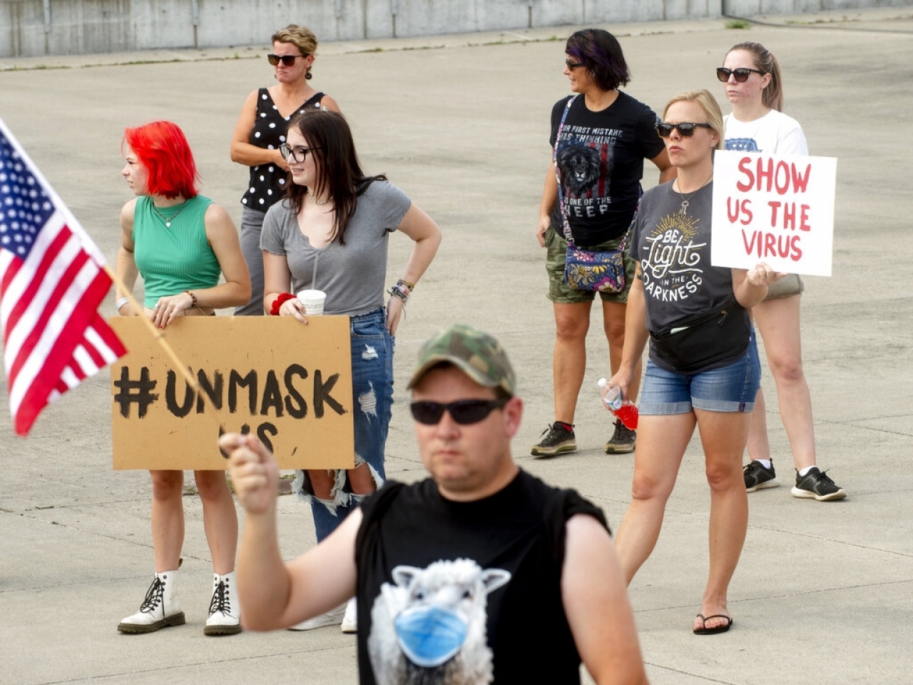 不同州份對是否要求學生在校戴口罩有不同規定,圖為有民眾抗議強制戴口罩。(美聯社資料圖片)