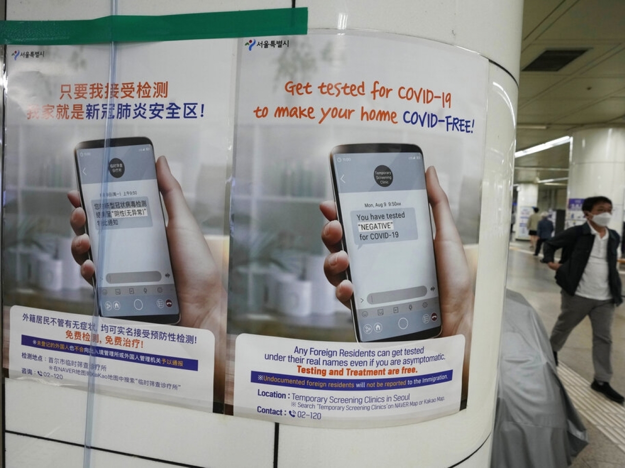 韓國地鐵站內張貼中英文防疫海報,讓在韓外籍人士了解防疫措施。(美聯社)