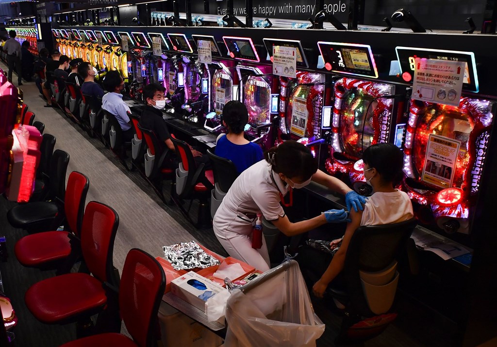 日本大阪市一間柏青哥店在本月13日與14日暫停營業,這兩天店內不打小鋼珠改打疫苗;機台上原本用來通知店員中獎的按鈕,也轉當民眾接種後身體不適時的通報按鈕。