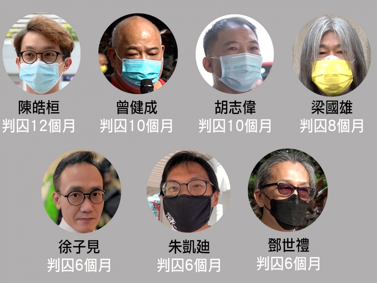 今天獲刑的7人分別是:現已解散的公民人權陣線(CHRF)前召集人陳皓桓(刑期12個月)、前區議員曾健成(10個月)、前立法會議員胡志偉(10個月)、前立法會議員梁國雄(8個月),前區議員徐子見(6個月)、前立法會議員朱凱廸(6個月)及”社民連”成員鄧世禮(6個月)。