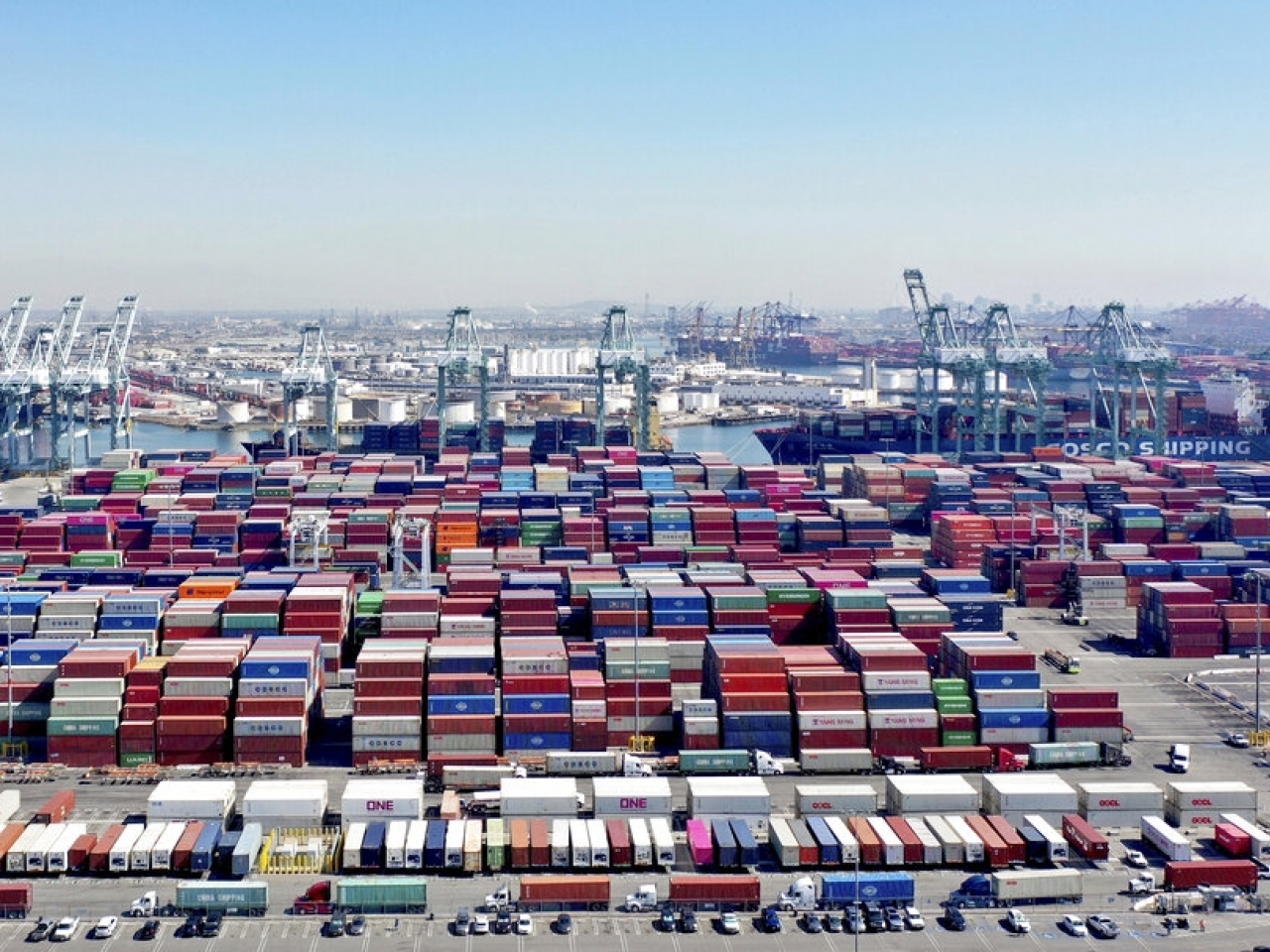 大批貨櫃積壓在洛杉磯港口,等待卸貨。(美聯社資料圖片)