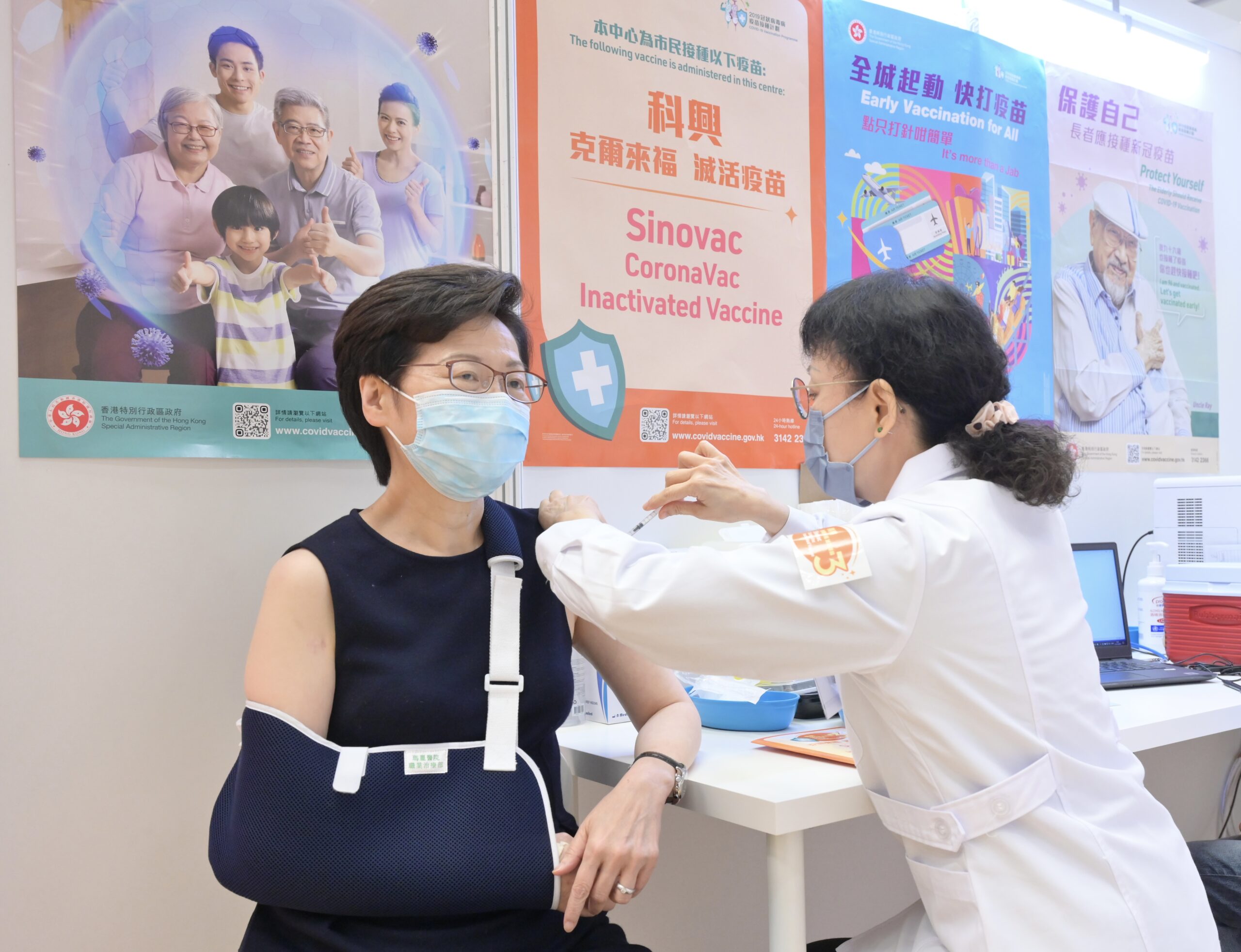 香港行政長官林鄭月娥今日(十一月十一日)在渣華道體育館社區疫苗接種中心接種第三劑科興新冠疫苗,並在負責統籌2019冠狀病毒病疫苗接種計劃的公務員事務局局長聶德權和食物及衞生局局長陳肇始教授陪同下視察中心運作。聶德權和陳肇始教授亦在今日接種第三劑科興新冠疫苗。