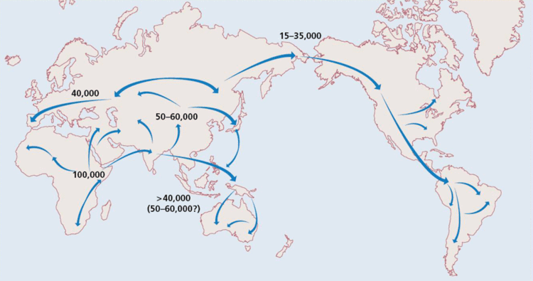 学术界主流认为,大约10万年前,晚期智人(也称“新人”)开始走出非洲,后来散布到世界各地;他们有用于交流和思维的工具——语言,是各地现代人的共同祖先。根据科学家近年的研究调查发现,晚期智人的腭部发生了充分的弯曲,这是发音的标志;因此,人类的语音也是在他们的身上出现的;当语言出现后,人类的文明完全进入了另外的一个层级。